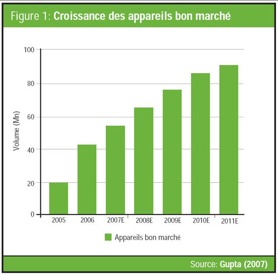 Les fournisseurs de services cellulaires ont aussi réduit les coûts des appareils ainsi que ceux des connexions mobiles. Reliance Communications a été la première à fournir des appareils entre 777 et 888 INR (19 à 23 dollars) (Prabhudesai, 2007), alors que Spice Telecom les offre pour 599 INR (15 dollars). La tendance à regrouper les bas tarifs avec les appareils bon marché représente une activité à faible marge et fort volume. D’ici 2010, le nombre des utilisateurs de mobile en Inde rurale devrait s’élever à 167 millions et ce modèle opérationnel contribuera largement à atteindre ce chiffre. La figure 1 montre le taux de croissance prévu des appareils bon marché en Inde (Gupta, 2007).