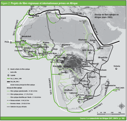 Pour ce qui est de l’infrastructure physique, l’Afrique, par rapport à d’autres régions du monde, manque d’infrastructures de communication internationale. Bien que « chaque mètre carré de l’Afrique soit couvert par la bande passante par satellite » (CRDI, 2005), les marchés du satellite dans la plupart des pays restent monopolistiques ou duopolistiques et font l’objet de frais de licence élevés et de conditions d’exploitation restrictives. Outre le satellite, l’Afrique se tourne également vers les câbles sous-marins de fibre optique. Ces réseaux de câble sont confrontés aux mêmes difficultés que les réseaux par satellite, mais croisent en plus plusieurs frontières nationales et doivent répondre aux conditions d’exploitation de chaque pays. En raison du manque d’harmonisation dans les politiques et les règlements, ce qui est permis dans un pays peut être interdit dans un autre, d’où un aspect dissuasif important au développement de ces réseaux.
