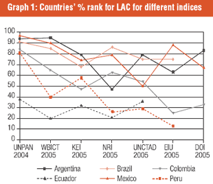 Graph 1 shows the lack of consistency across the different indices. The country results for different indices are shown here as a percentage of their ranking at the Latin American and Caribbean level. Thus, if the findings were similar across the indices, there would be incidence of parallel lines as there is for Argentina, Brazil and Colombia for the UNPAN, WBICT and KEI indices – as shown at the top left corner of the figure. This, however, is the only point of parallel findings – with widely divergent results. Kauffman and Kumar (2005) attribute this to the fact that there are three overarching perspectives for single item composite ICT indices, such as shown here. These are ICT readiness, ICT intensity, and indices attempting to measure impacts of ICTs. Minges’ (2005) work further illustrates the trade-offs or different strategies of assessments. This is shown particularly well by Table 1, a table he uses to depict the different choices for ICT infrastructure within indices.