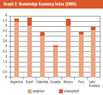 Transparency questions are not all pernicious. Some are simply questions of avoiding misinterpretation or imprecision because of lack of clarity around methods. Graph 2 provides an example of this. The Knowledge Economy Index offers the overall indicator in absolute terms or as adjusted for population. As can be seen in the figure, this results in a significant difference for Latin American economies with large populations such as Brazil and Mexico, where there are likely to be larger gaps between different socio-economic sectors and between rural and urban inhabitants.